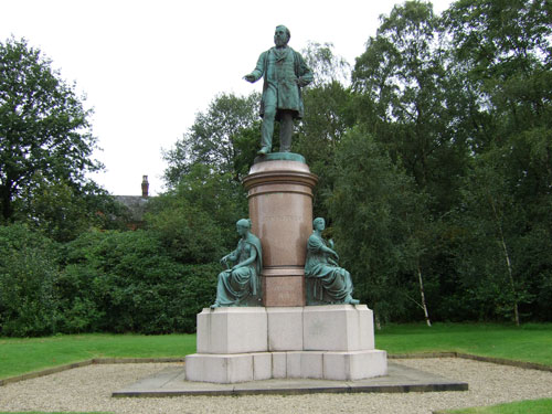John Platt's Bronze Statue, complete with circular pedestal upon a rectangular stone base flanked by four symbolic seated female figures representing, Engineering, Manufacturing, Science and Art.